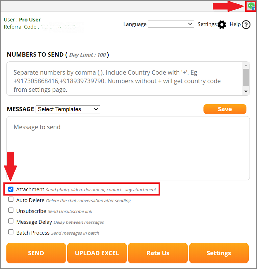 - Click on the WAExpresso icon and then in the Options tick the Attachment checkbox.
