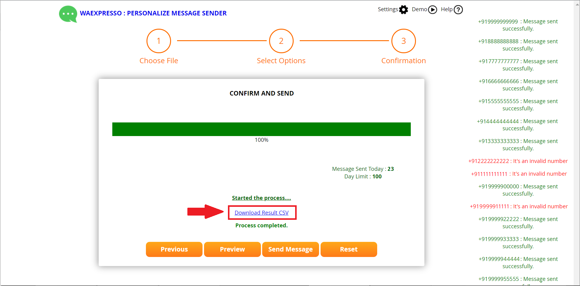 - Once the process is completed click the DOWNLOAD RESULT CSV link to download the result.