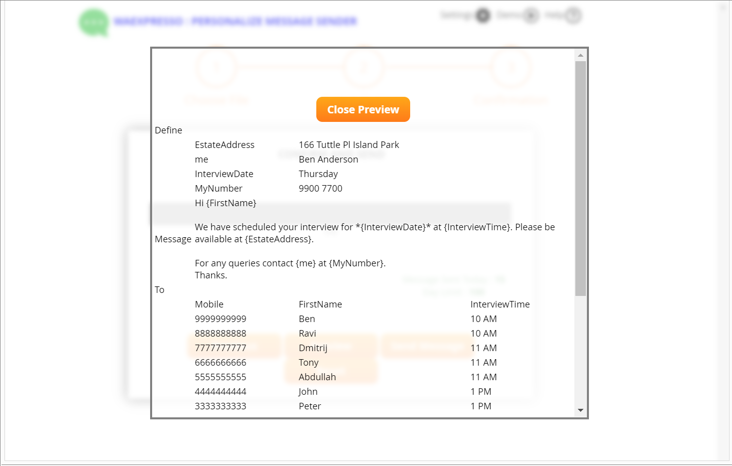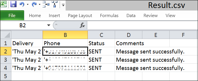 'Start' and 'Stop' are the start and end row numbers in the Excel to whom messages are to be sent