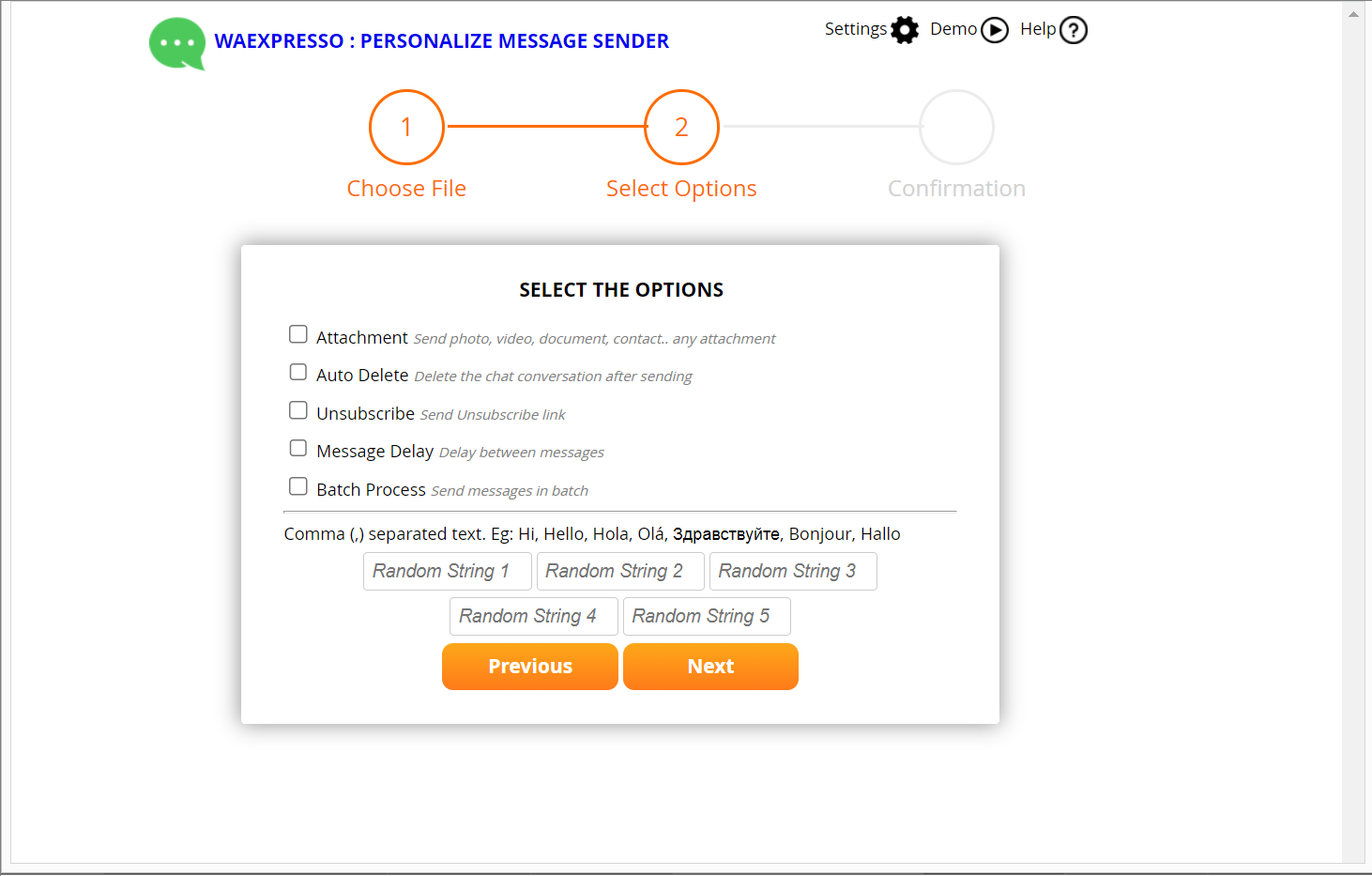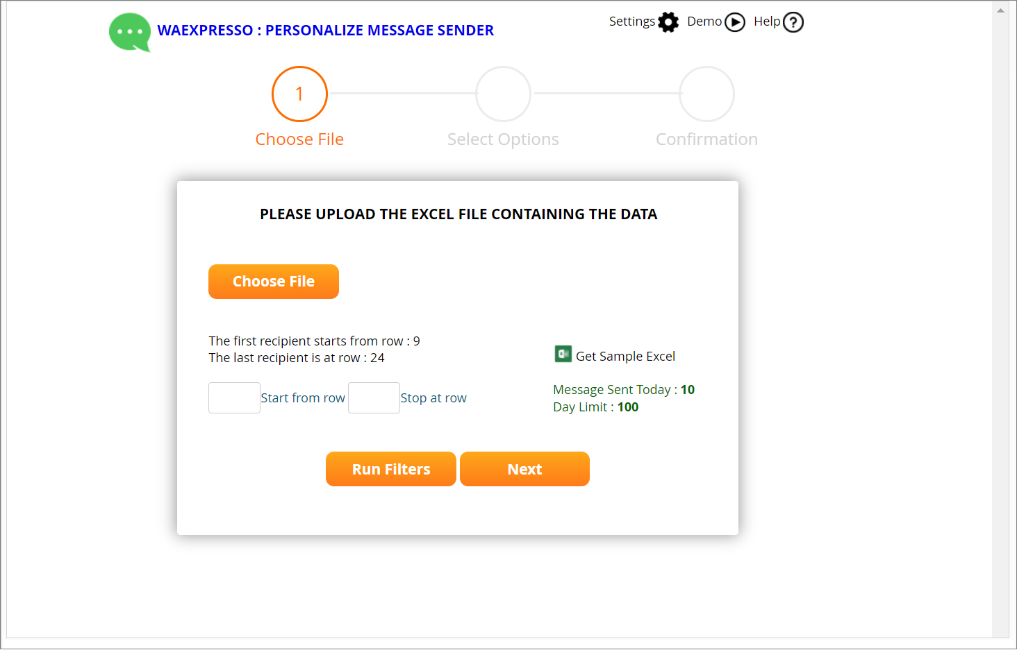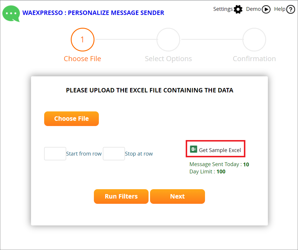 - Click on CHOOSE FILE and select your file. In case you want to send to only some numbers, enter your START and END row numbers. If not, do not enter anything in these 2 fields. Click on NEXT.