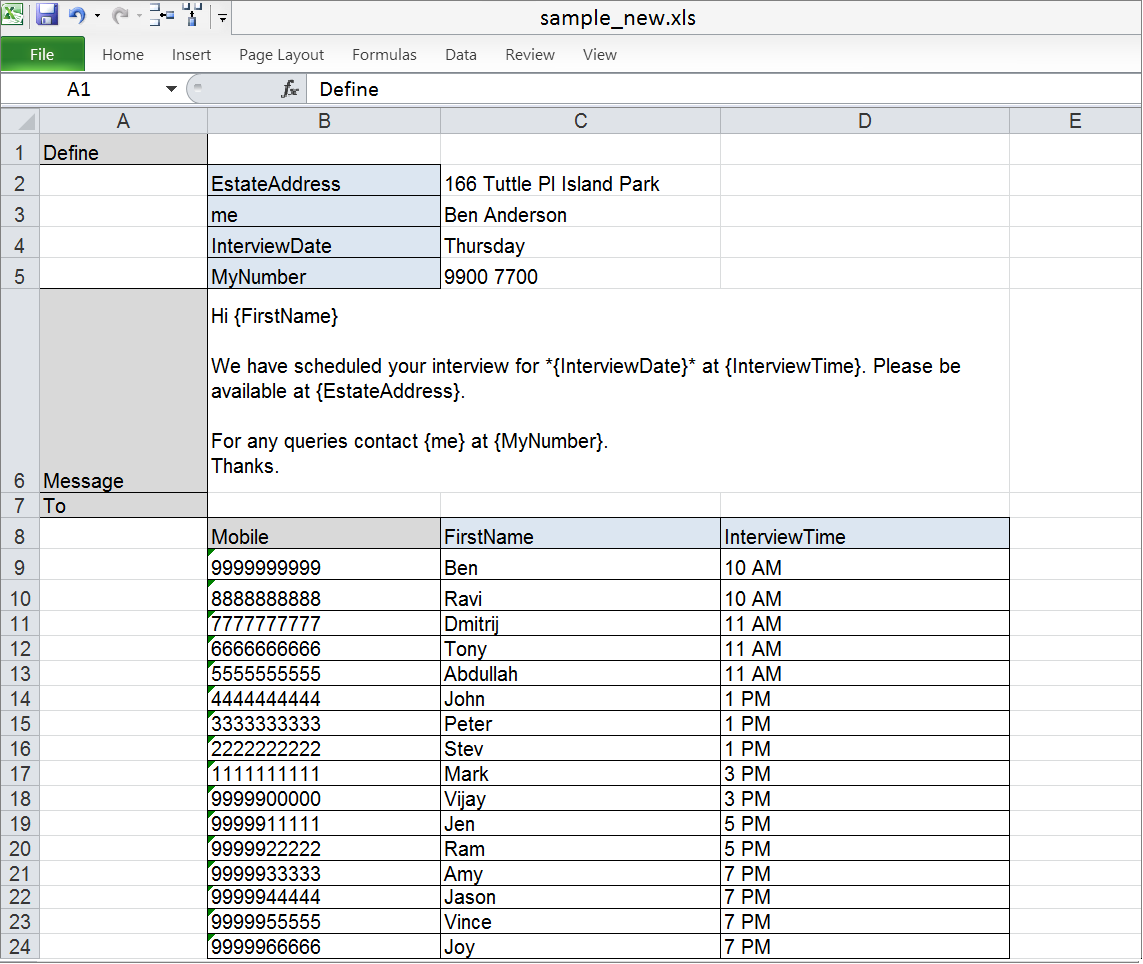 - Update your recipient Whatsapp numbers in the Excel. You can see that the data starts at ROW NUMBER 9 and ends at ROW NUMBER 24.