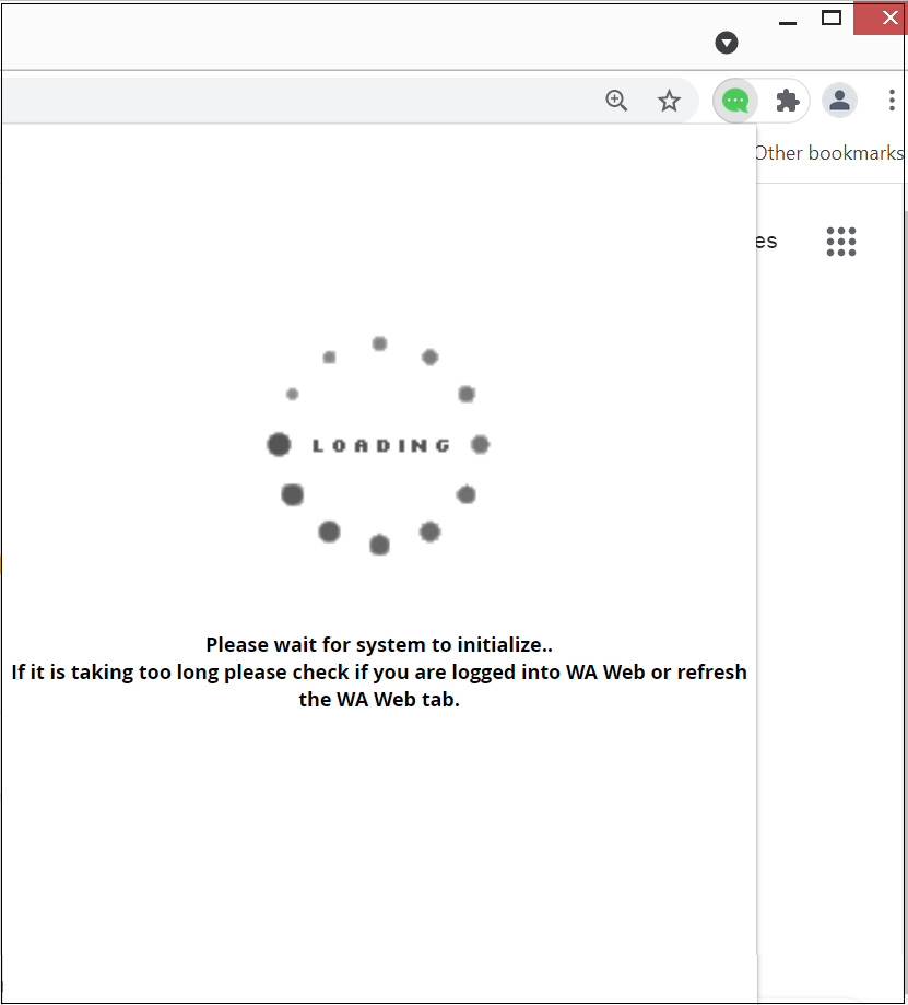 Please wait for WhatsApp web to load properly. Check if your WhatsApp is loaded. Your phone should be connected to internet for WhatsApp to load. Once the WhatsApp tab is loaded, the system gets initialized and loads automatically. Until then, it waits for WhatsApp to load. Kindly check the WhatsApp tab.